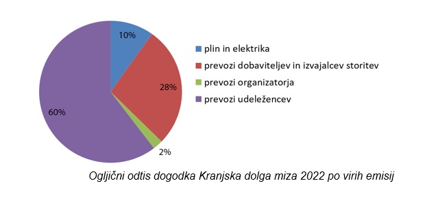 Ogljični odtis dogodka Kranjska dolga miza 2022 zaradi porabe energentov in prevozov je znašal 589,7 kg ekv CO2 oz. 5,9 kg ekv CO2 na udeleženca dogodka. V ogljičnem odtisu prevladujejo emisije zaradi prevozov in med njimi zavzemajo največji delež emisije zaradi prevozov udeležencev oz. gostov dogodka (60 %). Emisije zaradi prevozov organizatorja predstavljajo majhen delež ogljičnega odtisa (2,3 %) ter kažejo na ozaveščenost zaposlenih organizatorja in pripadnost ideji okolju prijaznejšega dogodka. Prizorišče dogodka se oskrbuje z elektriko iz brezogljičnih virov. Emisije zaradi porabe plina predstavljajo 9,8 % ogljičnega odtisa.