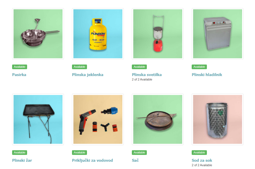Predmete za knjižnico so prispevali iz lastnega fonda društva, nekaj so jih pridobili z donacijami posameznikov in podjetij, nekaj pa so jih tudi kupili. Že ob pričetku delovanja je knjižnica obsegala več kot sto predmetov, kot so drobilnik vej, polaroidni fotoaparat, prekopalnik, sušilnik sadja, masažni aparat, šivalni stroj, plezalni pas… Izposoja je možna za en teden, vsak uporabnik si lahko naenkrat izposodi največ tri predmete in izposojo enkrat podaljša.